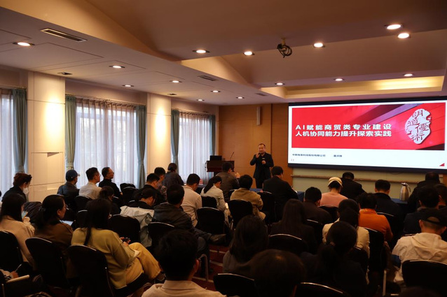11月6日,学院在海斯曼数字酒店多功能会议室举办“海斯曼”讲坛,以“AI赋能商贸类专业建设”为主题,紧扣产教融合核心目标,将“企业出题、校企共答、市场阅卷”理念贯穿全程。中教畅享科技股份有限公司副总经理潘洪锋受邀主讲,学院领导、专业负责人及师生代表参会。