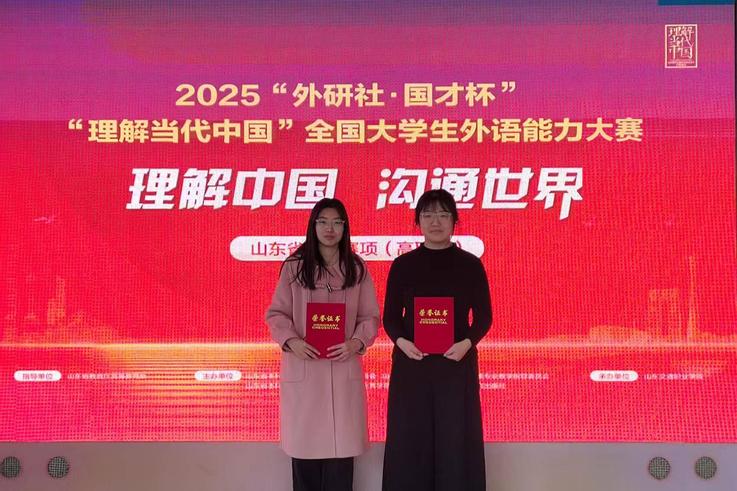 近日,2025“外研社·国才杯”“理解当代中国”全国大学生外语能力大赛(高职组)山东赛区写作大赛、演讲大赛落幕。本院商务英语专业学生张诗琪获得写作大赛金奖并将代表山东赛区参加全国总决赛,李晓蕊获得演讲大赛银奖。