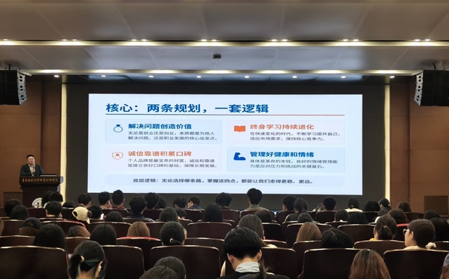 活动紧扣我院毕业生就业创业痛点,围绕职业规划、求职实战、AI赋能、理性创业四大板块,为同学们送上可落地、能执行的行动指南。李栋结合当前就业市场形势,引导毕业生正视竞争压力,清晰认知自身实践能力强、定位务实、适应速度快的核心优势,鼓励大家将焦虑转化为自驱力,用硬实力抢占职场先机。